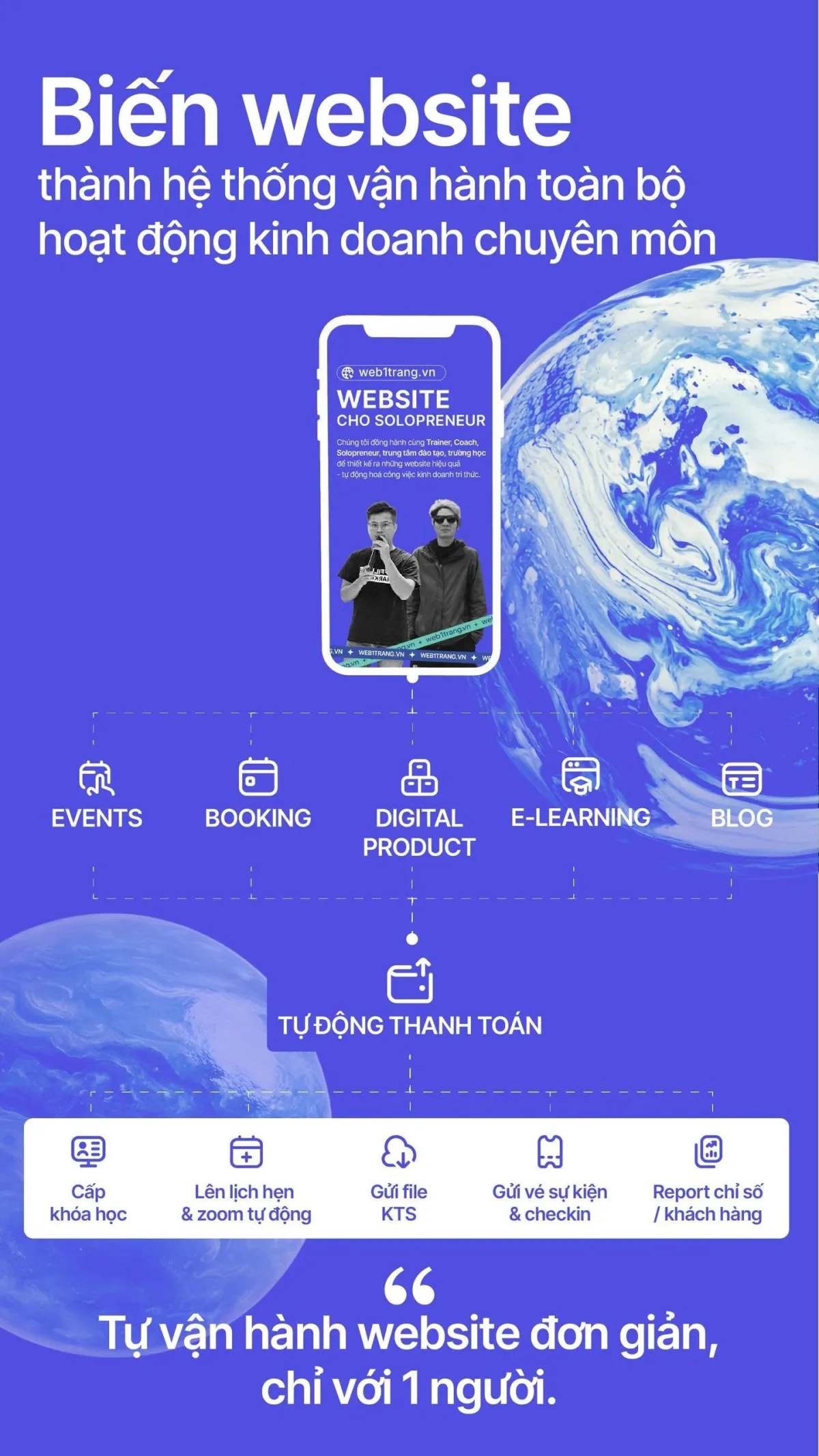 Không chỉ là một website. Đây là nền tảng để bạn dạy, kinh doanh và xây dựng thương hiệu cá nhân được tích hợp các hệ thống được tự động hoá các hoạt động kinh doanh chuyên môn như: Booking, Event, E-learning, Digital Product, Blog, Email marketing, Automation…