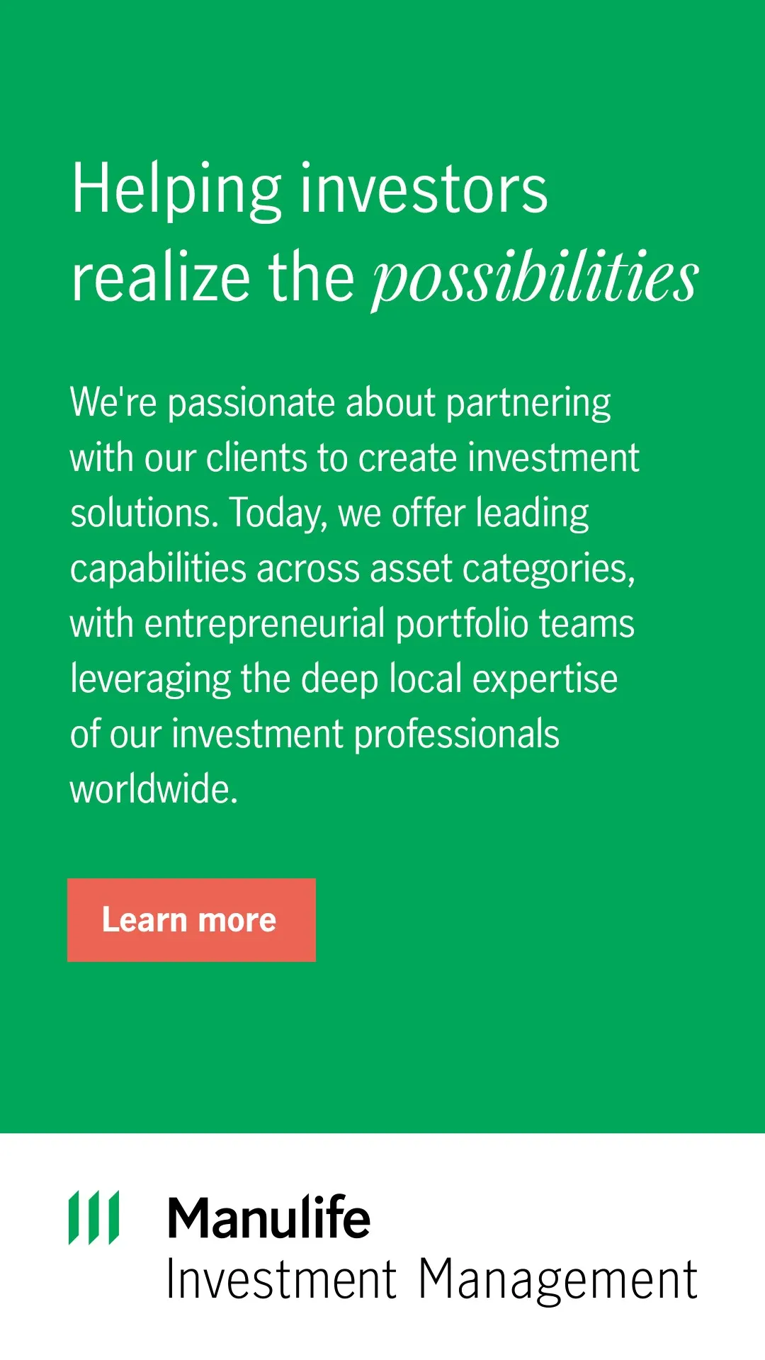 Manulife Investment Management is the global wealth and asse t management segment of Manulife Financial Corporation. We draw on more than a century of financial stewardship and the full resources of our parent company to serve individuals, institutions, and retirement plan members worldwide. Headquartered in Toronto, our diverse capabilities in public and private markets are strengthened by an investment footprint that spans 18 geographies. We complement these capabilities by providing access to a network of unaffiliated asset managers from around the world. We're committed to investing responsibly across our businesses. We develop innovative global frameworks for sustainable investing, collaboratively engage with companies in our securities portfolios, and maintain a high standard of stewardship where we own and operate assets, and we believe in supporting financial well-being through our workplace retirement plans. Today, plan sponsors around the world rely on our retirement plan administration and investment expertise to help their employees plan for, save for, and live a better retirement.