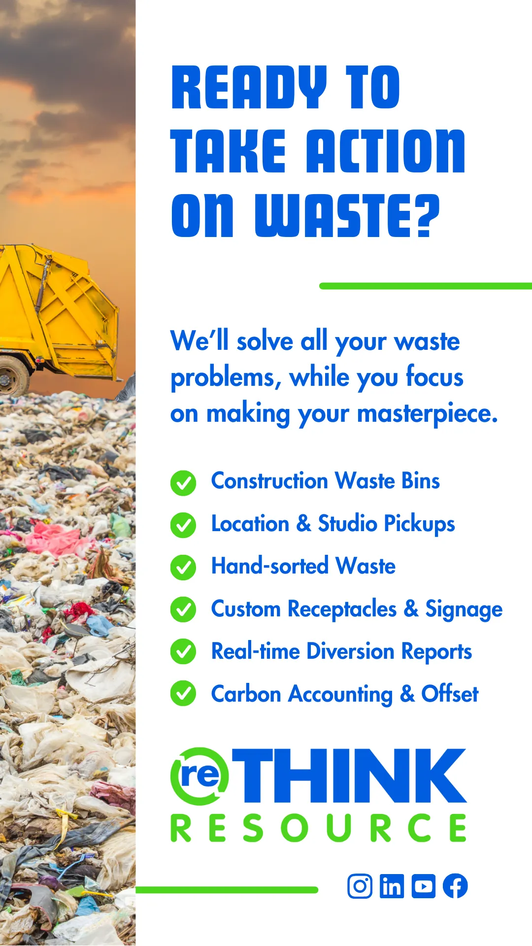 With a comprehensive range of diversion solutions for pretty much any waste stream, and our soon-to-launch Carbon Accounting & Offsetting program, we’re your one-stop solution to minimizing on-set waste and emissions.
