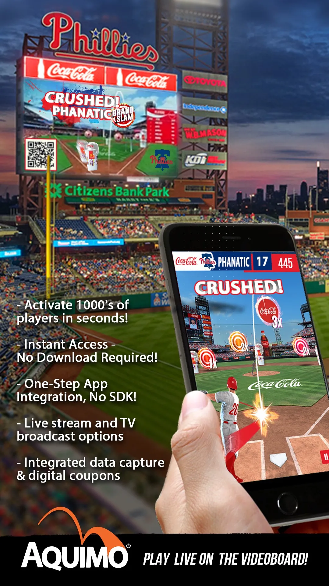 Aquimo is the Leader in Marketing Gamification! Our in-stadium fan engagement technology platform is used by teams and brands to integrate fan engagement and brand impressions into a unique audience experience. No download required! Aquimo is live in every major professional sports league in the U.S. as well as the NCAA. Aquimo is revolutionizing sports marketing with our fully customized, interactive stadium products. Fans simply take out their phones, scan the QR and play high energy mobile games on the stadium videoboard & win amazing prizes! Fans at home watching the broadcast can also participate in @ home challenges.