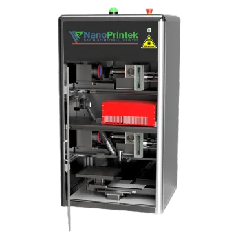 Imagine being able to print a complete multimaterial device structure from solid materials in one run without ever touching a drop of ink. That’s exactly what NanoPrintek’s printers offer. The technology works by ablating nanoparticles from a target pellet using a finely tuned laser, propelling them toward a substrate, and then sintering them instantly into a fully formed pattern. Everything happens in real time, without chemicals, binders, or additional processing.