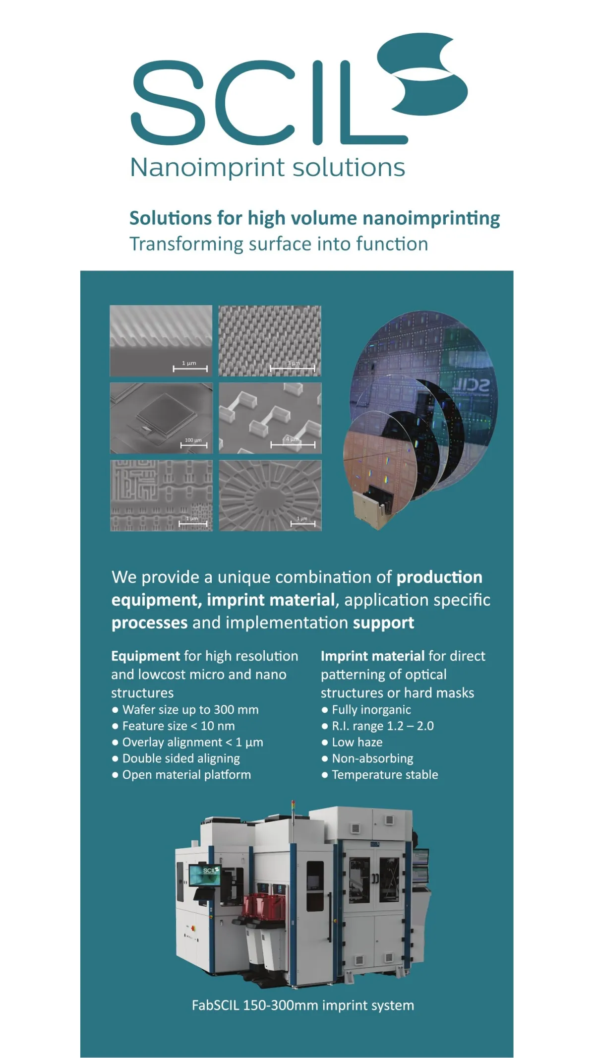 SCIL Nanoimprint Solutions offers solutions for patterning nano-structures on large wafers by using its unique and proprietary lithography technology (SCIL).