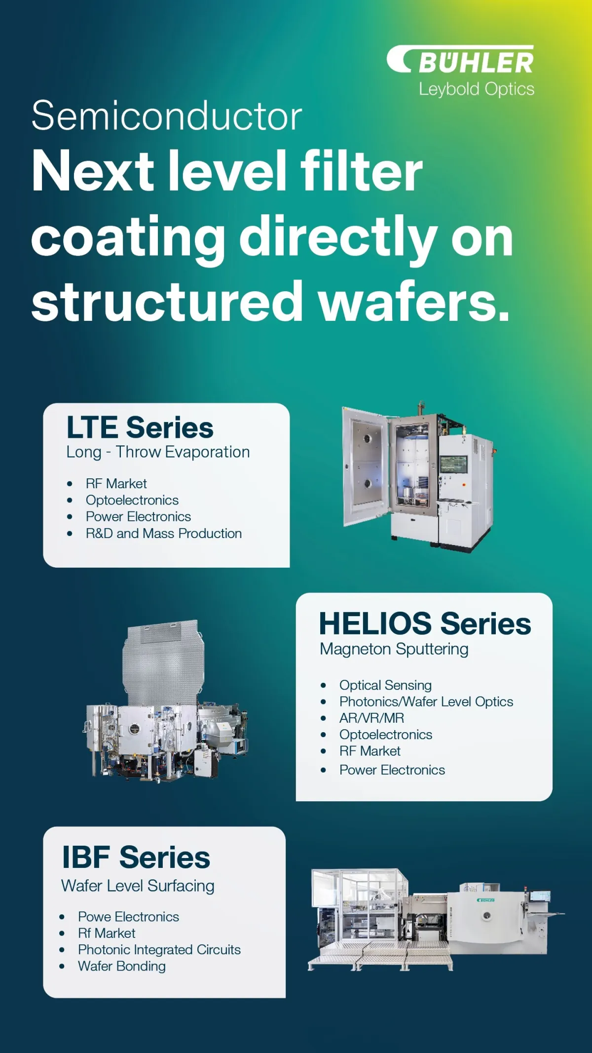 With over 160 years of experience, Bühler Leybold Optics is a leading supplier of thin-film vacuum coating technology. Our state-of-the art solutions include semiconductor, precision or ophthalmic optics applications, the metalization of headlights for the automotive industry, architectural and automotive glass, roll-to-roll substrates for capacitors or flexible electronics. All of our solutions are tailored to your specific market demands.