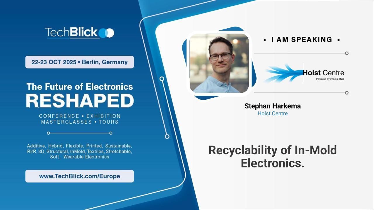 Hybrid & Printed Electronics (HPE) offer many advantages compared to conventional printed circuitry boards (PCBs), including reduced thickness and weight, increased freedom of design and form, simplified product integration, wear comfort and conformability, the use of recyclable thermoplastics, and additive printing of metal circuitry. A direct comparison of HPE- and PCB-based electronics at product level reveals that HPE indeed poses a lower environmental burden. Moreover, several circular practices may be used to further build on this first favourable outcome. At present, most HPE is not readily recycled, in part due to their unique selling points. HPE typically contains less (printed) metal than PCBs, making recycling of these metallized plastics less attractive for recyclers. Furthermore, the seamless integration of metals, semiconductor components and plastics increases the complexity of material salvation at end-of-life. This is especially the case with In-Mold Electronics, where the circuitry and components are over-moulded with a thermoplastic encapsulation. Our presentation will elaborate on our closed-loop recycling approach with high yields for plastics, metals, and embedded components.