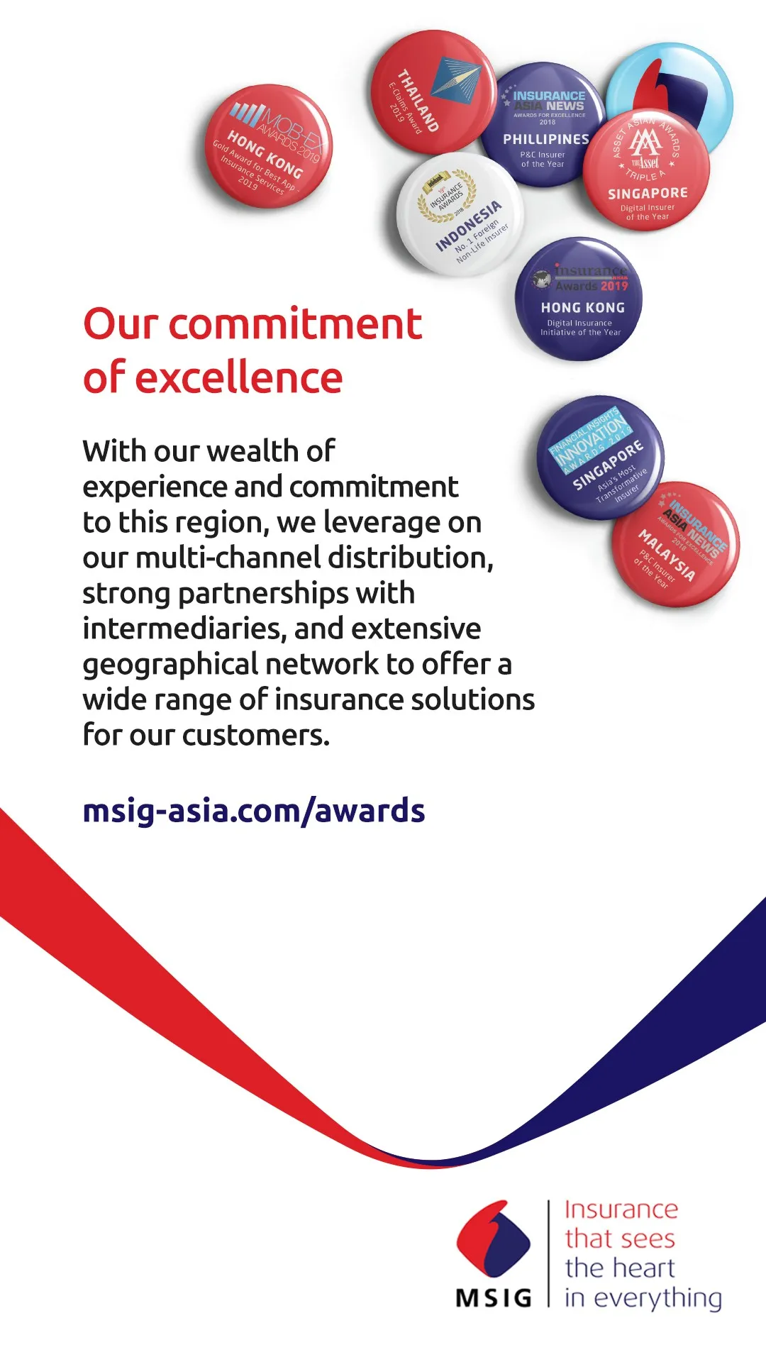 MSIG is a member of the MS&AD Insurance Group, one of the world’s top 10 non-life insurance group, with A+ Stable credit rating. A leading insurance brand in Asia, MSIG has a wide geographical network, and leverages on multi-channel distribution and strong intermediary partnerships to offer insurance solutions across personal and commercial lines. In the region, MSIG was named “Asia's Most Transformative Insurer" by IDC Financial Insights, "Digital Insurer of the Year" by The Asset, and “Claims Initiative of the Year” by Insurance Asia.