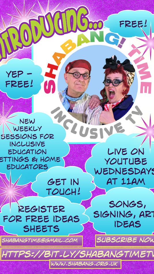 Since March 2020 we've been unable to run face to face sessions so have been filming our projects and making them available on line for FREE together with free downloads of songs and accompanying worksheets - we're on YOU TUBE - "Shabang Time TV" susbscribe for FREE