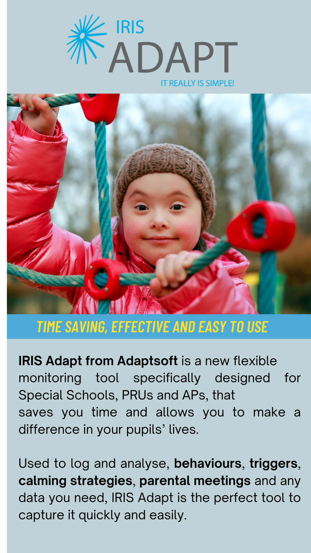 At Adaptsoft we have over 10 years experience of providing secure online data capture and analysis systems to schools. We are experts in the provision of customised behaviour, concern, intervention and other logs for special schools, PRUs and AP.
