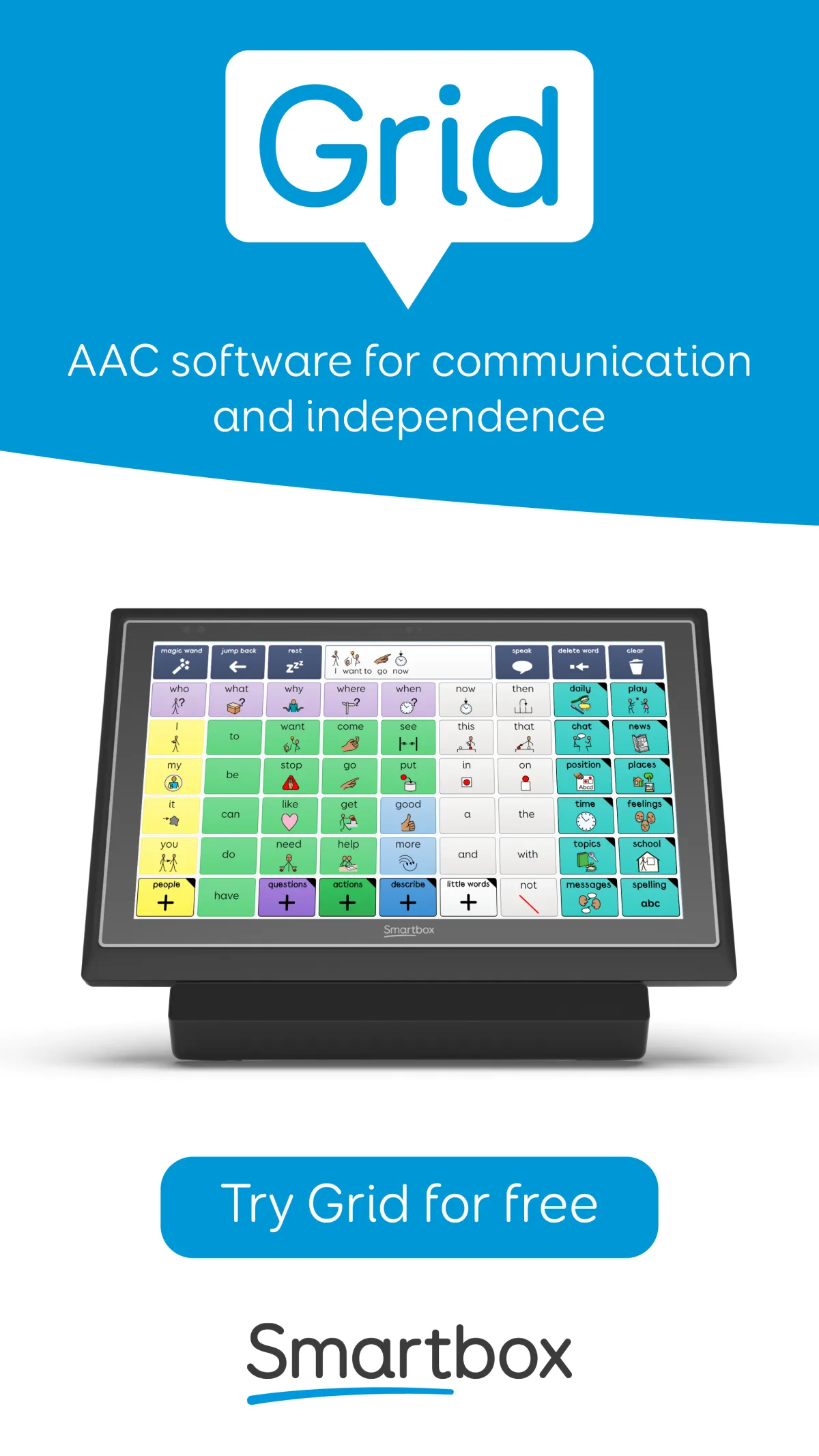 All our communication aids are powered by Grid, allowing you to communicate, control your environment and access your computer. Grid includes a wide range of robust resources for people of all ages with different levels of literacy. From learning in new and interactive ways to intuitive and efficient communication for text and symbol users, we have solutions to support you now and in the future.