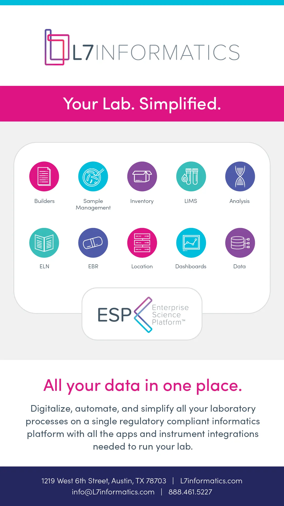 L7|ESP is designed to solve today’s life science and biopharmaceutical industry challenges with cell therapy processes with limited workflow automation and critical data compliance requirements. Siloed multi-vendor IT systems make it challenging to create an integrated and validated environment for biologics manufacturing with processes involving a mixture of paper, software systems, instruments, environmental monitoring systems, and bioprocess equipment. L7|ESP is a unique regulatory compliant platform that provides an integrated software platform for digitizing the sample to drug process with features including equipment integration, Electronic Batch Records (EBR), MES, CPV, inventory, sample/ location management, and analytics/statistical processing with reports and dashboard and QC LIMS.