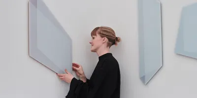 Most recently, Sutherland has designed, fabricated and installed her first piece of public art – a commission for the National Decommissioning Archive in Wick, Caithness. The building is heavily influenced by the cultural and physical landscape of Caithness, as well as the quality of the light. In response, Sutherland created a series of mirrored glass panels, using water from local rivers in place of deionised water during the silvering process.The panels hang on a north-south axis in the reception area, at an angle which allows the raking morning light to be redirected more deeply into the space as the sun moves around the building.
