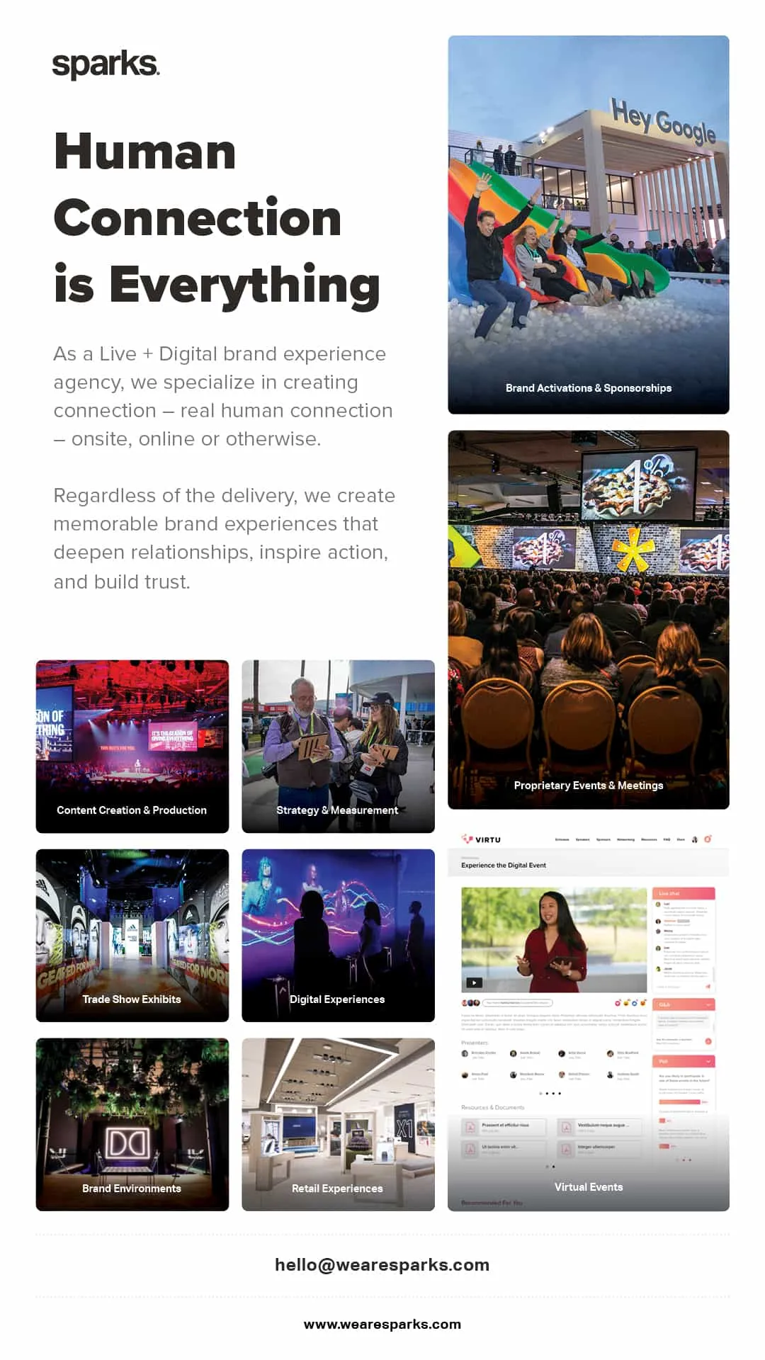As a live + digital brand experience agency, we specialize in creating connection--real human connection--onsite, online or otherwise. From strategy, creative and digital, to fabrication, production and measurement, we’re the strategic partner smart marketers turn to for innovative brand experiences.