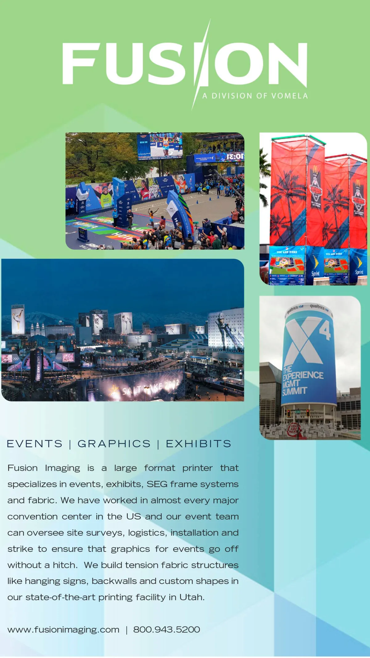 Fusion Imaging is a large format printer that specializes in events, exhibits, SEG frame systems and fabric. We have worked in almost every major convention center in the US and our event team can oversee site surveys, logistics, installation and strike to ensure that graphics for events go off without a hitch. We work with exhibit houses to supply SEG graphics for today's most popular systems and we are a preferred print partner of beMatrix and Aluvision. We build tension fabric structures like hanging signs, backwalls and custom shapes in our state-of-the-art printing facility in Utah. You won’t find a more creative group of problem solvers that go out of their way to bring ideas to life.