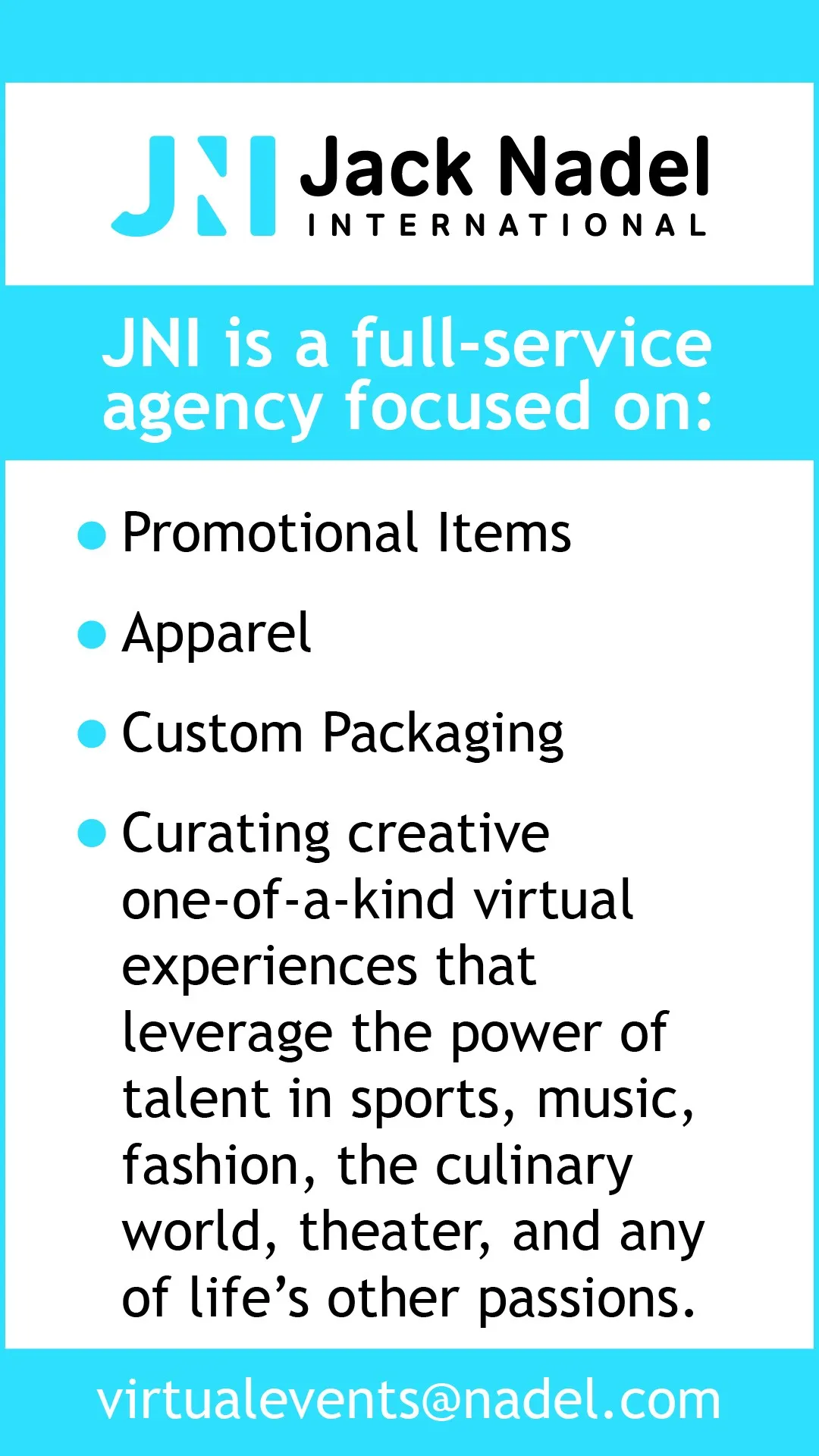 Jack Nadel International (JNI) is a premier provider of targeted advertising and marketing solutions and has been in the branded merchandise industry for over 65 years.