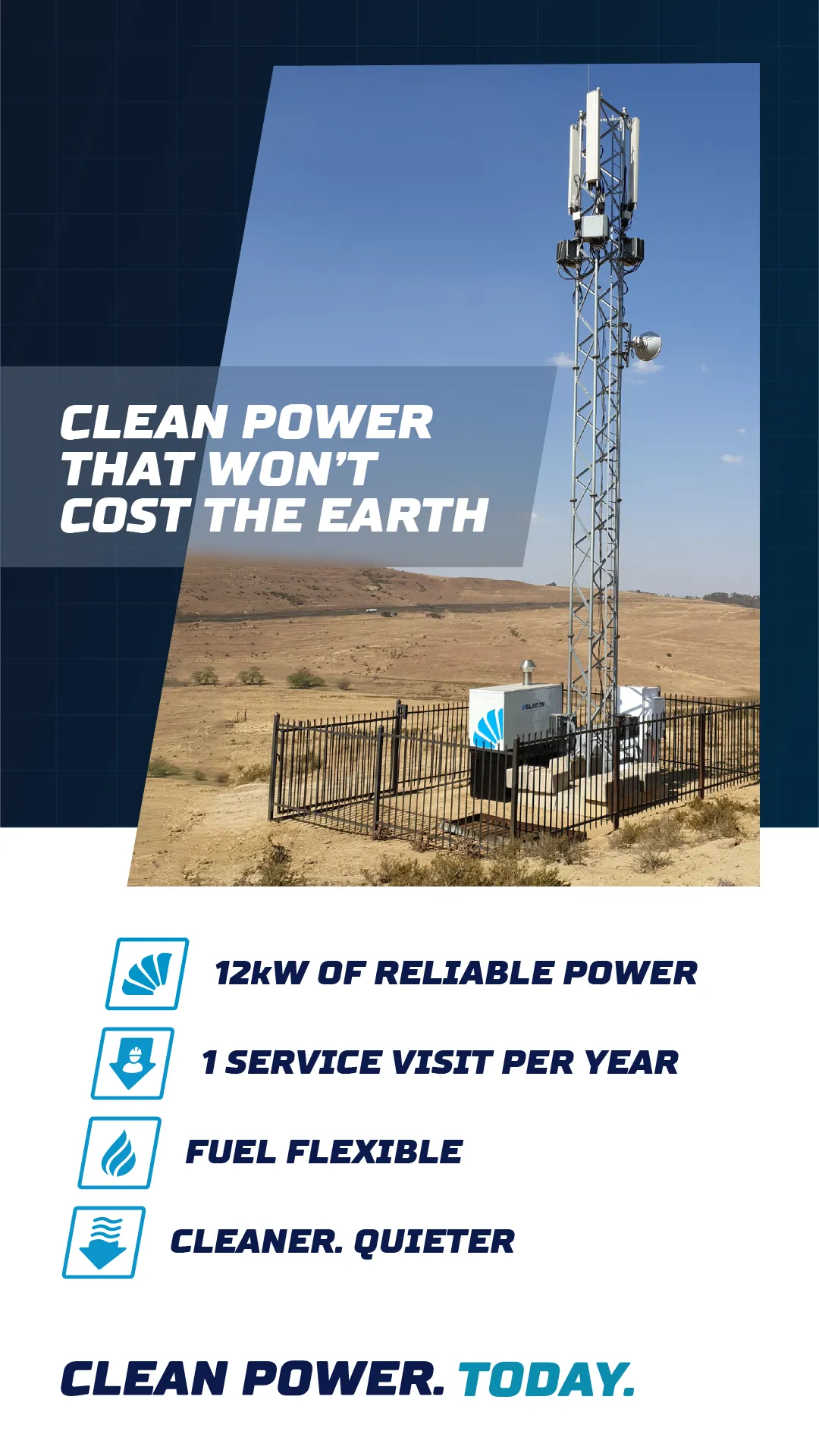 This clean, quiet, and cost effective power solution is already reducing monthly operational costs for mobile networks, TowerCos and ESCO’s today!