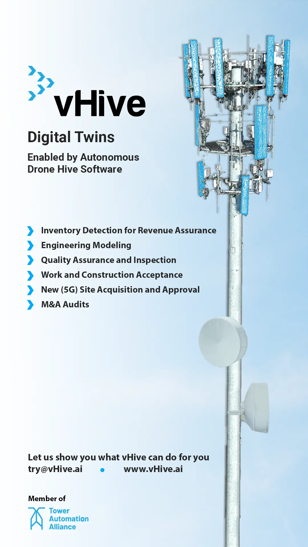 vHive is a global leader of drone software solutions. vHive is the only software solution that enables enterprises to deploy autonomous drone hives to create digital twins of their field assets. vHive accelerates enterprises’ continuous digital transformation, enabling them to make better decisions based on accurate field data and analytics. vHive is making an impact in a variety of industries including communication towers, construction, insurance and rail by dramatically cutting operational costs, generating new revenue opportunities and boosting employee safety.