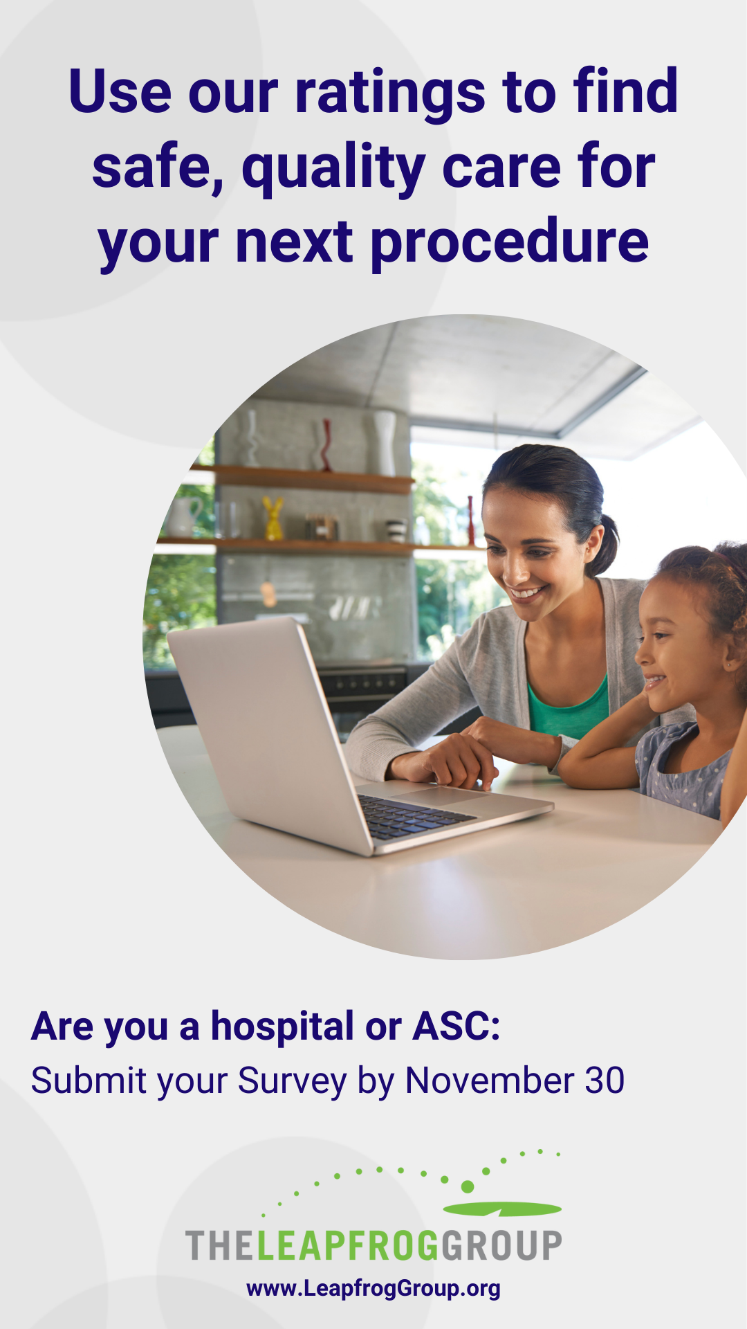 The flagship Leapfrog Hospital Survey and new Leapfrog Ambulatory Surgery Center (ASC) Survey collect and transparently report hospital and ASC performance, empowering purchasers to find the highest-value care and giving consumers the lifesaving information they need to make informed decisions.