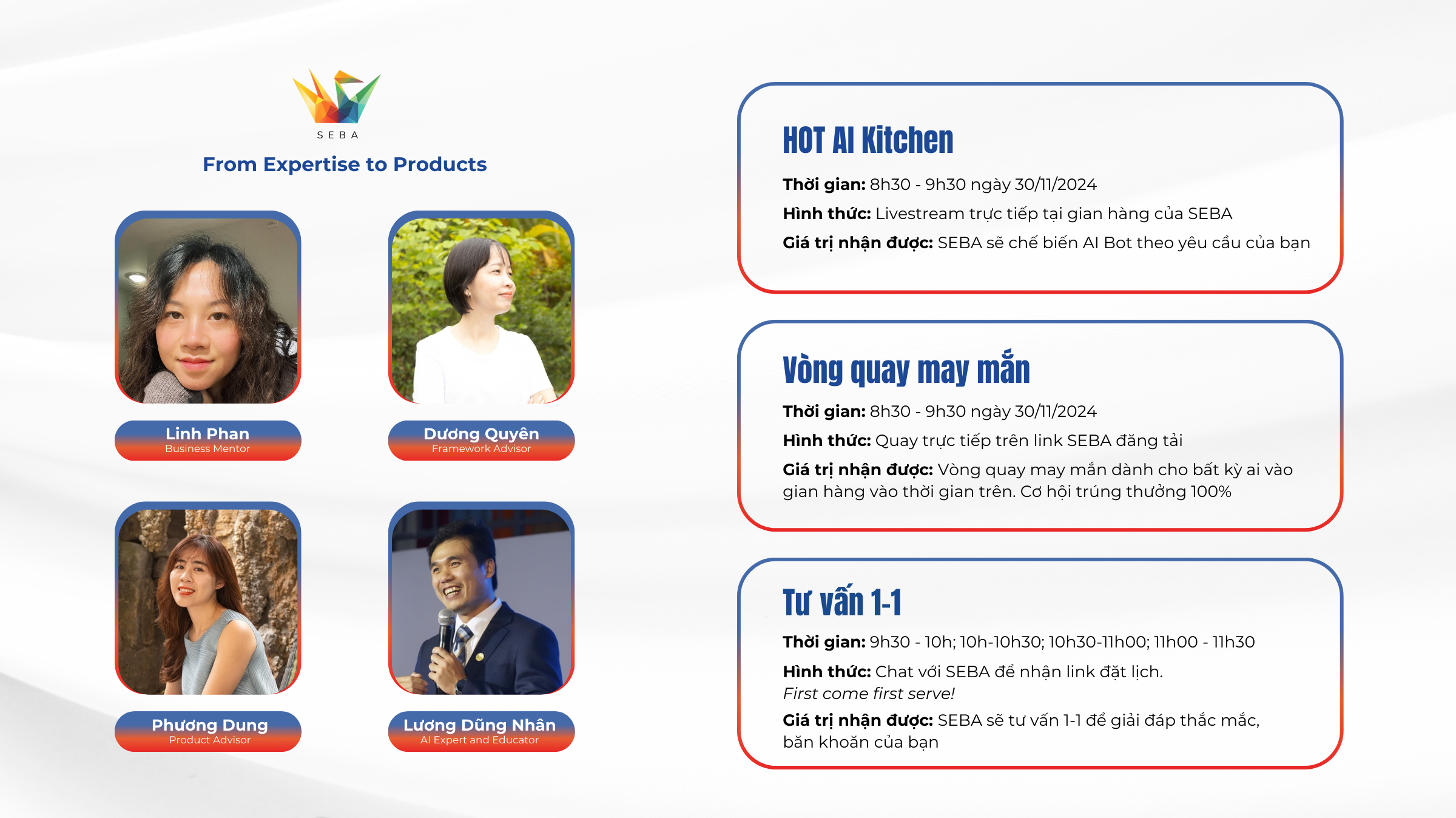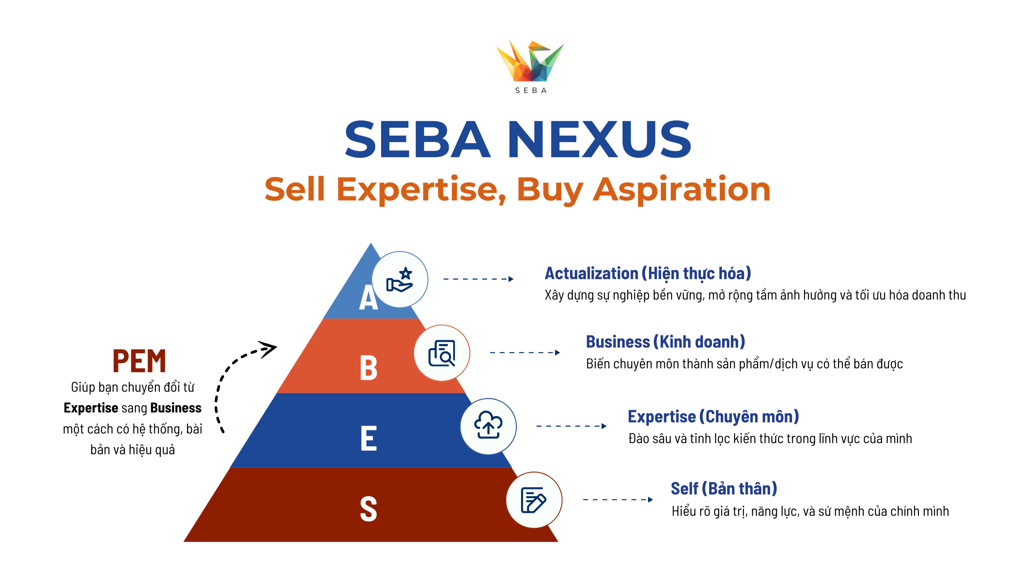SEBA - Self-Expertise-Business-Actualization, hay như chúng mình vẫn nói: "Sell Expertise, Buy Aspiration". Khi bạn chia sẻ chuyên môn với thế giới, điều bạn trao đi không chỉ là kiến thức. Đó là nguồn cảm hứng, là động lực để người khác dám khám phá và tin vào tiềm năng của chính họ.