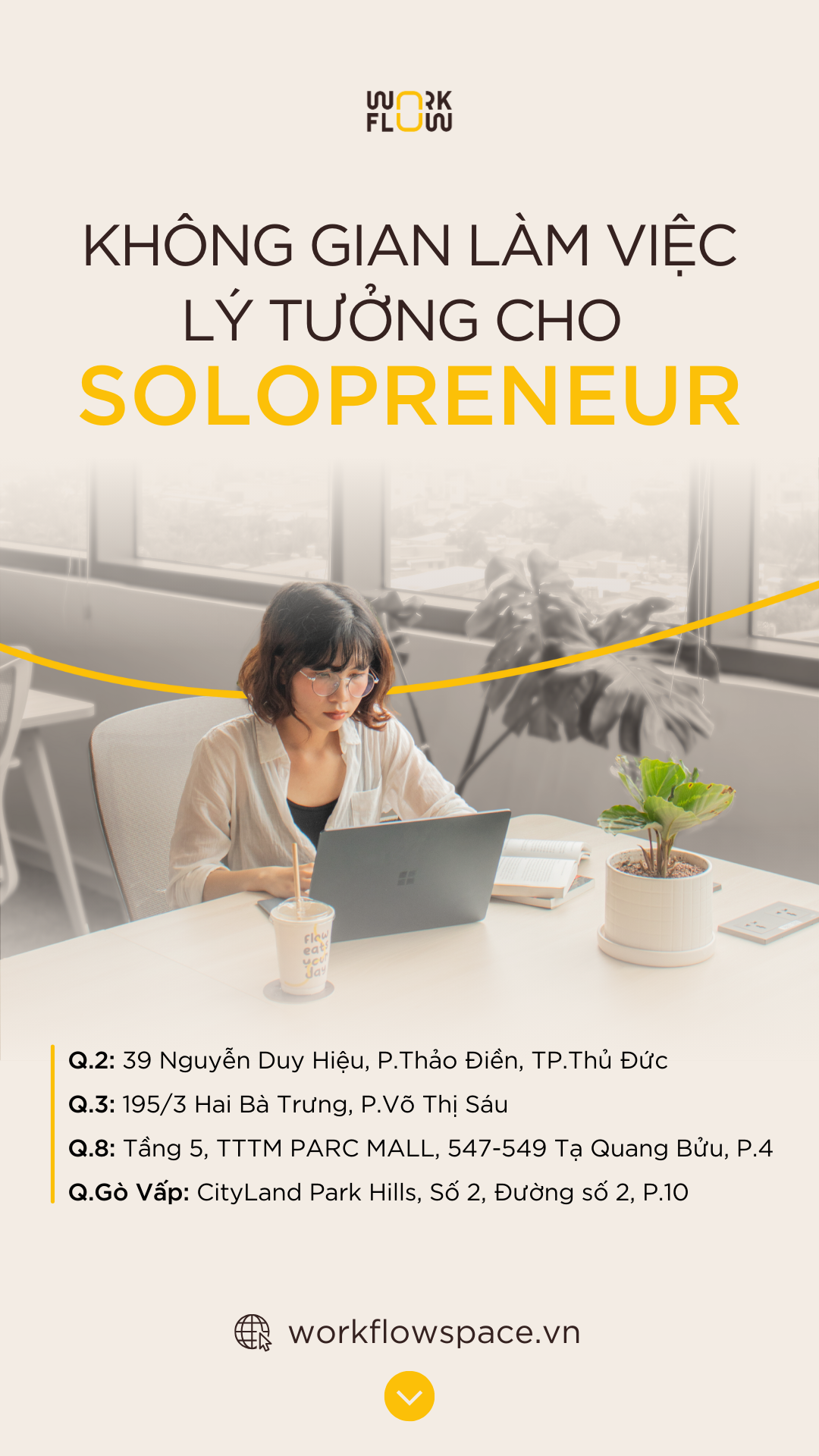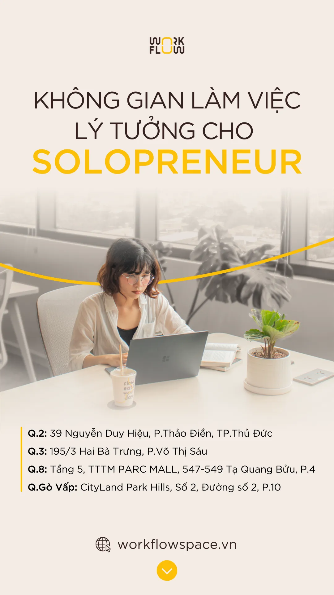 WORKFLOW SPACE là không gian làm việc chia sẻ đa dịch vụ gồm: không gian FnB, WorkPOD và Membership dành cho các nhà khởi nghiệp, sáng tạo & chuyên gia. Tại đây, họ có thể tự do lựa chọn phong cách và không gian kết nối, làm việc hiệu quả cho riêng mình.