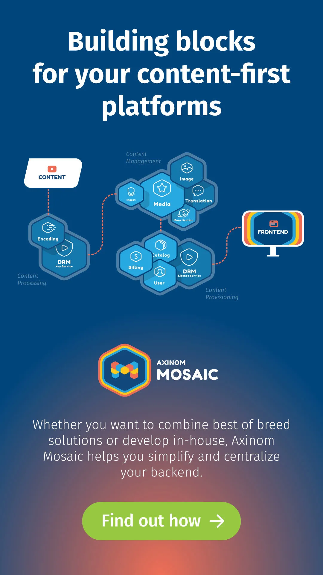 Axinom Mosaic’s range of services includes solutions for content processing, management, provisioning, as well as security via a multi-DRM. Our solutions are supported by globally deployed interfaces and services with extensive APIs for enabling integrations with third-party or existing customer systems and services. Through such integrations, our products are capable of handling subscribers, payments, reporting, personalization, and much more.
