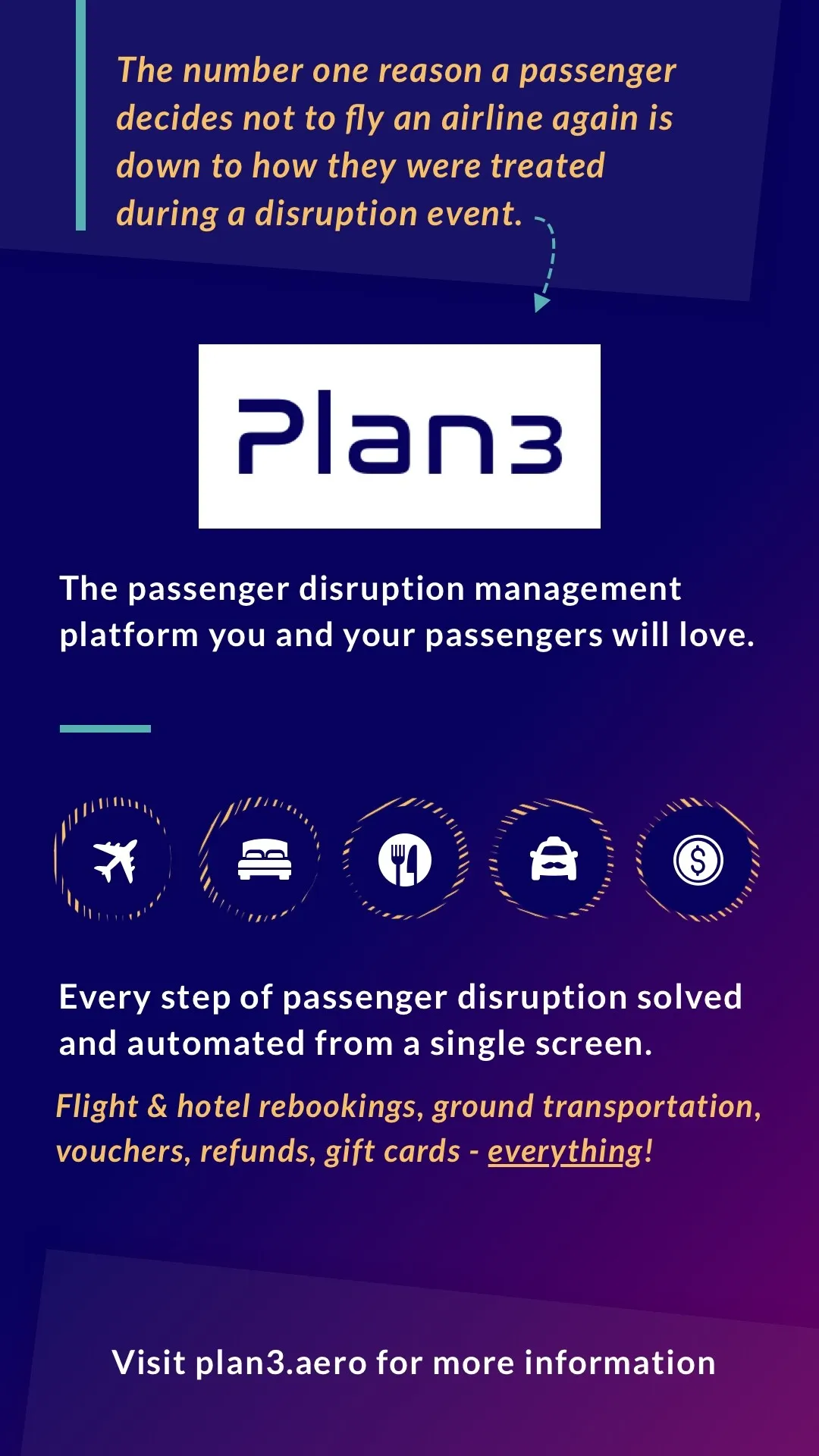 Simply put, Plan3 solves every aspect of passenger disruption, automatically sourcing holistic solutions with eyes on the entire passenger journey.