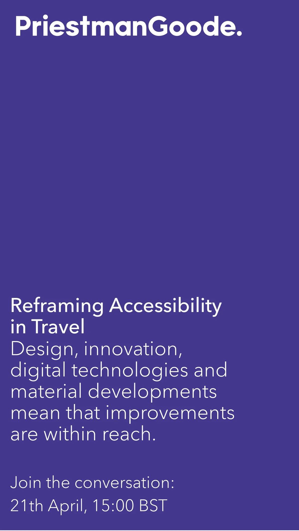 PriestmanGoode is a global design company that specialises in infrastructure, aviation, transport, hospitality, and product design. Our purpose lies in designing a better, more sustainable future. People-centric to the core, we have been improving and transforming everyday experiences for millions of people around the world for over thirty years. As travel design specialists, we work with our client teams to create considered customer journeys across digital and physical products and services. With departments for strategy and branding, interior and product design, CMF and visualisation, we manage each project with a holistic, top-down approach, ensuring that projects are delivered on time and to budget.