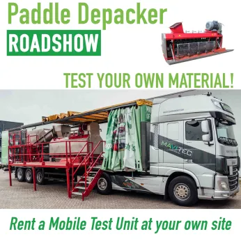 Maximize the value of your waste! Mavitec Green Energy is specialized in high quality food waste recycling and depackaging solutions with high separation efficiency. Our machines separate the organic material from the packaging and deliver a very clean (>99,5%) organic output that is extremely suitable for biogas installations. The Paddle Depacker handles up to 30m3 material per hour and delivers a clean plastic fraction as well. Want to test your own material at your own site? The Paddle Depacker Roadshow is also available for rental. The machine is installed on a trailer and will be located at customer’s site.