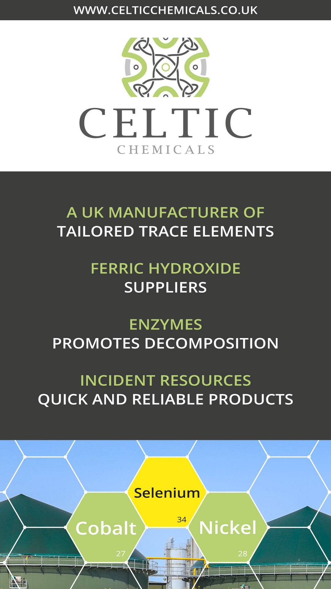 From our Port Talbot factory and warehouse Celtic Chemicals Ltd manufacture and distribute a range of products to optimise your biogas production.
