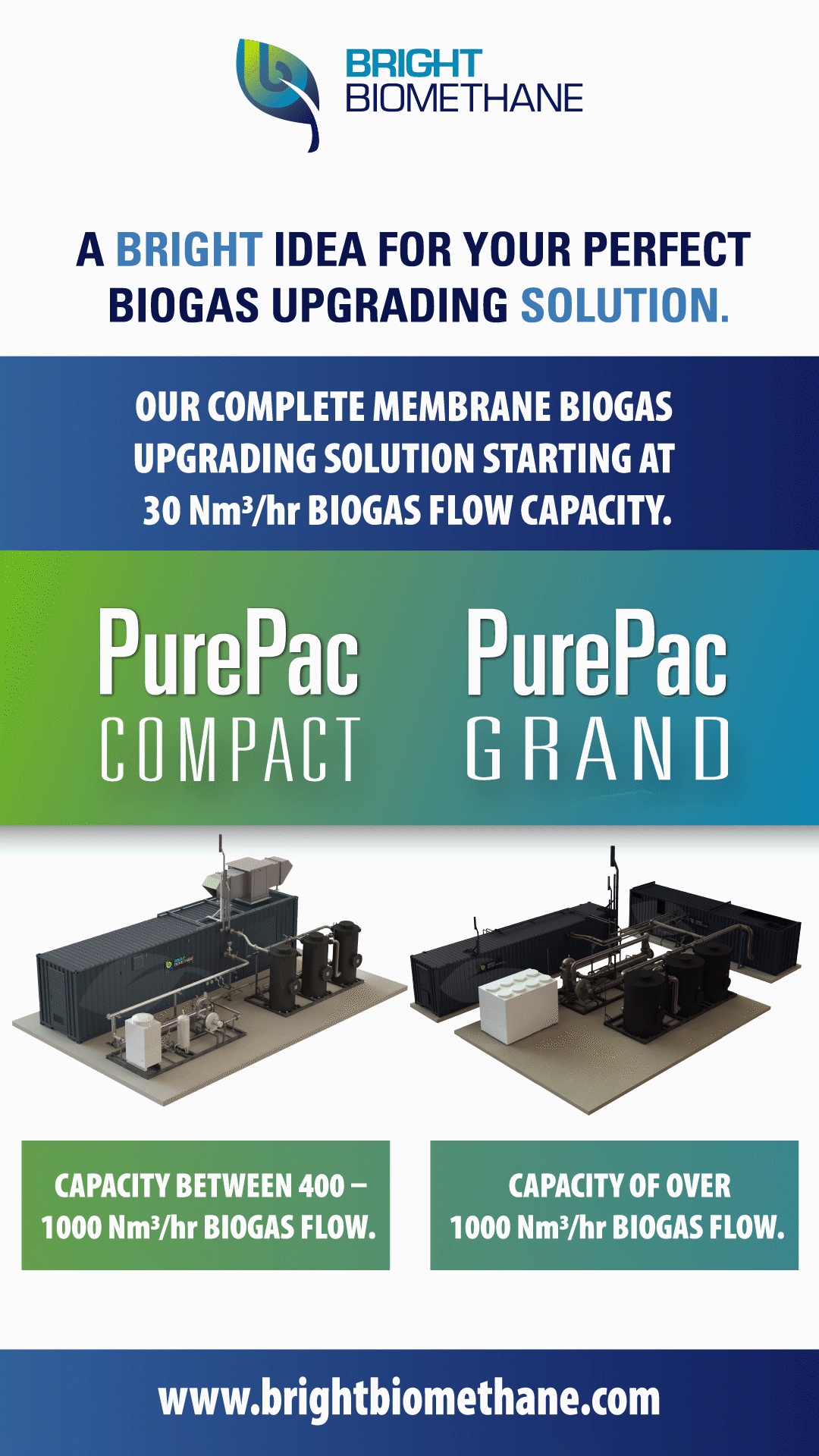 Bright Biomethane offers PurePac biogas upgrading systems using membrane technology to upgrade biogas, produced from any form of waste or biomass feedstock, to biomethane for gas grid injection, compression to bio-CNG or virtual pipeline transport. A Bright CO2 recovery unit can be integrated to liquefy and produce food-grade CO2.