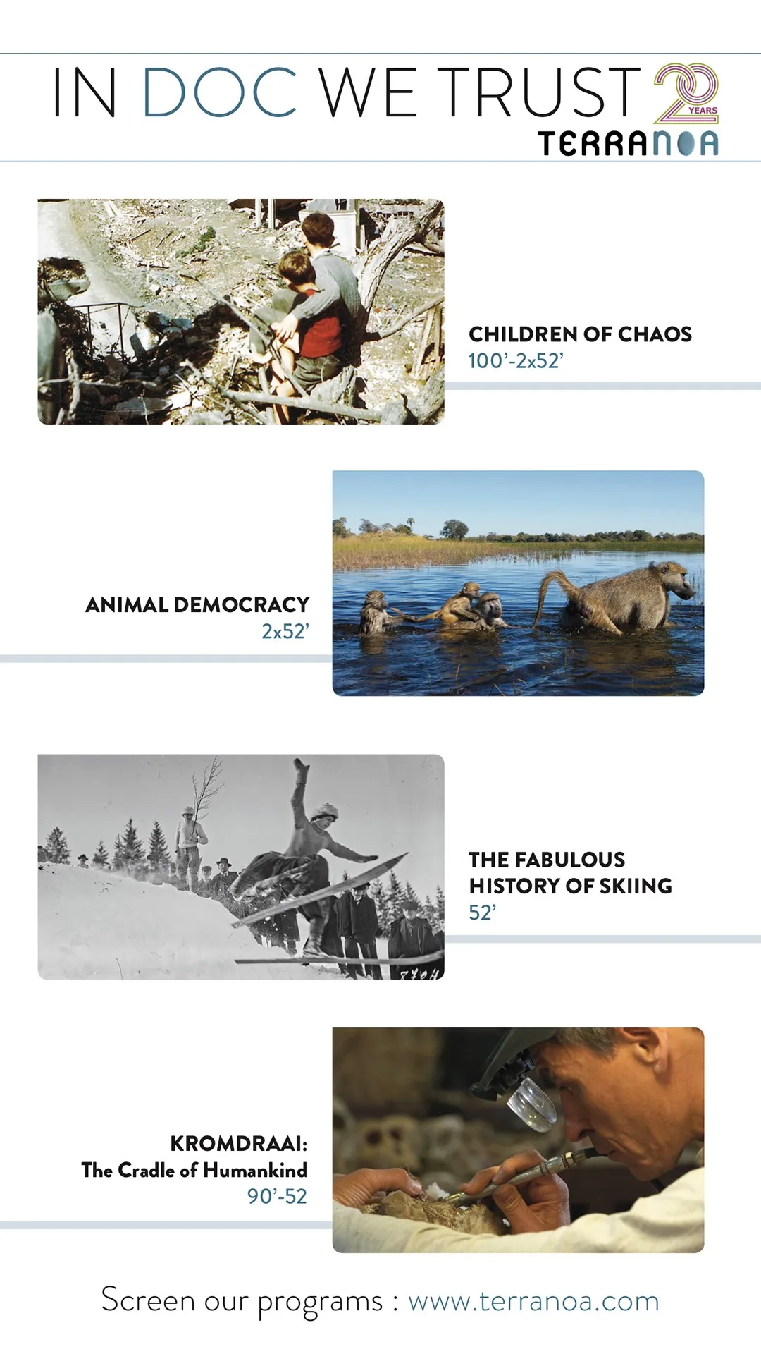 With over than 20 years of expertise Terranoa has established itself as one of the leading French distribution companies. Our company has become a benchmark for innovative high-end factual programmes, working with independent producers worldwide. Our catalogue is rich and diverse, with over 2,000 hours of Factual content aimed at the top end of the market. Our preferred genres include history, science, wildlife, travel and adventure and topical current affairs titles.