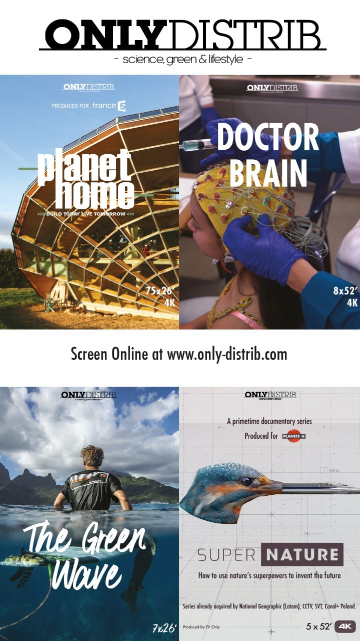 ONLY DISTRIB is a global reference in smart documentaries and magazines. With a catalogue of more than 3000 hours of SCIENCE, GREEN & LIFESTYLE programs, in HD and 4K, this label of Distribution has developed a qualitative, positive programming, always focusing on the future.