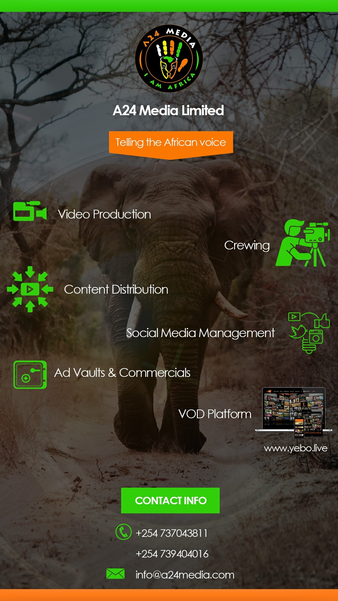 Africa 24 Media Ltd is a Pan African Media Company based in Nairobi. We have built a solid reputation as a leading creator of factual content in Africa.