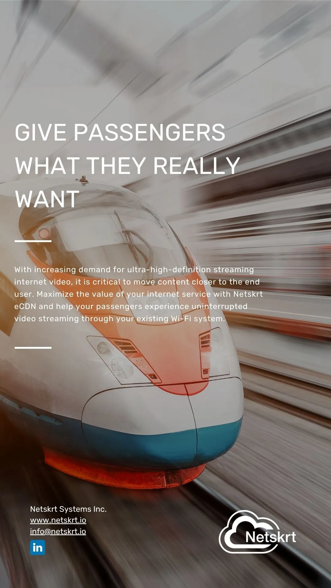 Netskrt Systems solves an intractable and frustrating problem: the inability for air and rail passengers to partake in the rich trove of streaming video content available from providers such as Amazon, BBC, Disney and many others. With Netskrt’s innovative edge Content Delivery Network (eCDN), the passenger video experience is virtually indistinguishable from what they enjoy at home. Using existing onboard Wi-Fi system and completely compatible with 4G/5G cellular and satellite, Netskrt extends the reach of internet video beyond the outskirts of the network without increasing internet connectivity costs.